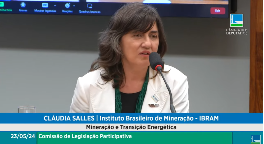 A gerente de sustentabilidade do Instituto Brasileiro de Mineração (IBRAM), Cláudia Salles, participou, nesta terça-feira (21), de audiência pública nas comissões da Amazônia e dos Povos Originários e Tradicionais; e de Minas e Energia da Câmara dos Deputados para debater sobre a Política Nacional de Minerais Estratégicos, com ênfase na Amazônia.